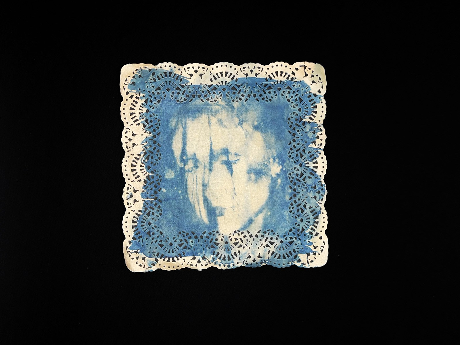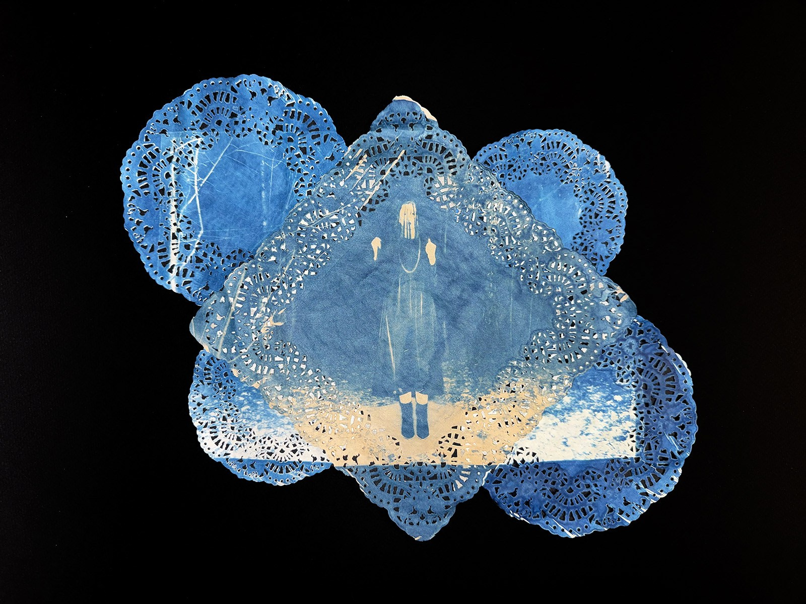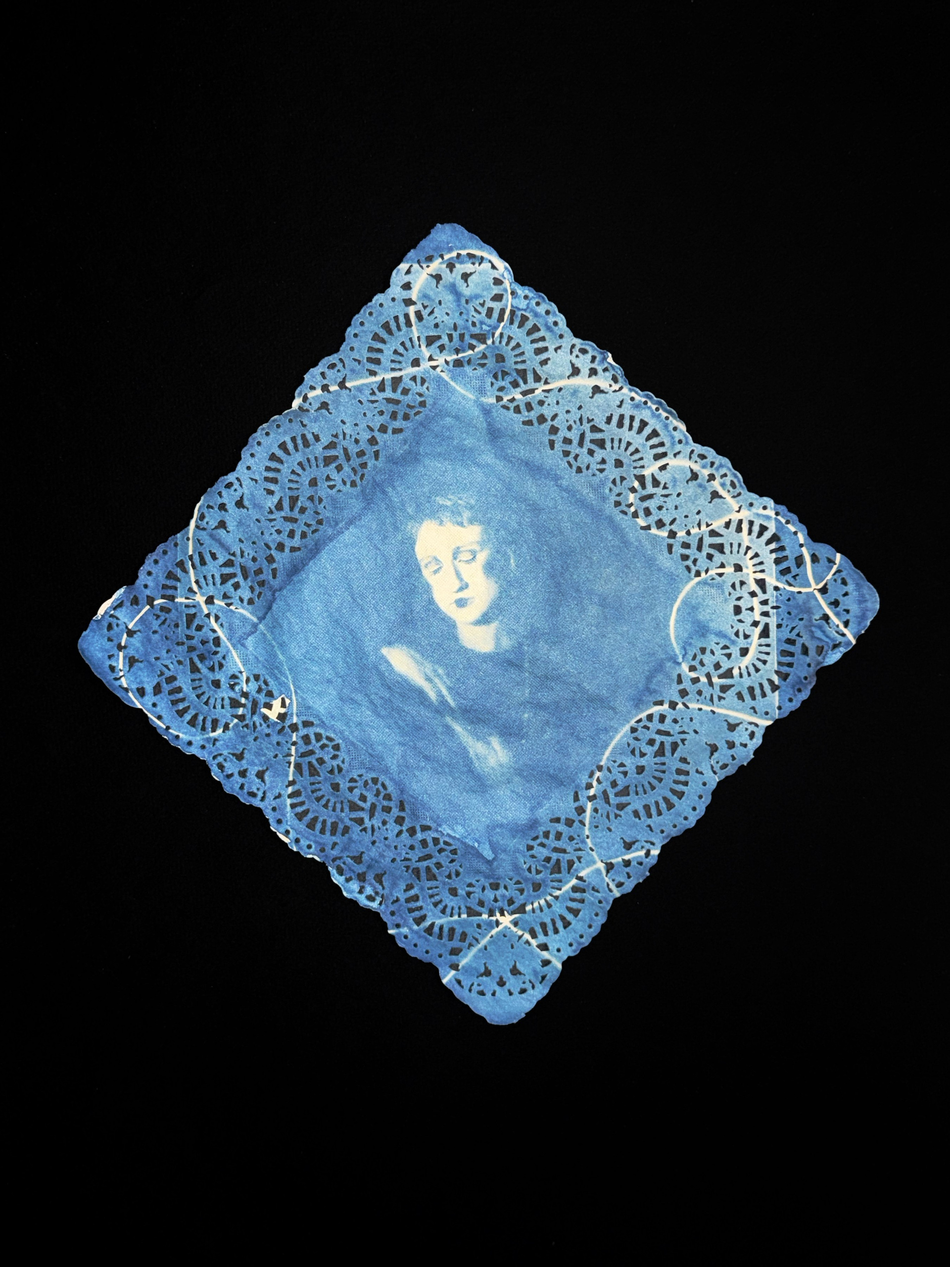 Использование цианотипии на пористом, тонком материале создаёт дополнительный смысловой уровень. Неровности, разрывы и вариативность печати становятся визуальными следами времени, уязвимости и трансформации. Изображение проявляется не как жёсткое утверждение, а как процесс — смягчающийся, вытекающий, изменяющийся. Так же изменчивы и коллективные представления, и культурные коды, которые мы наследуем и пересобираем.