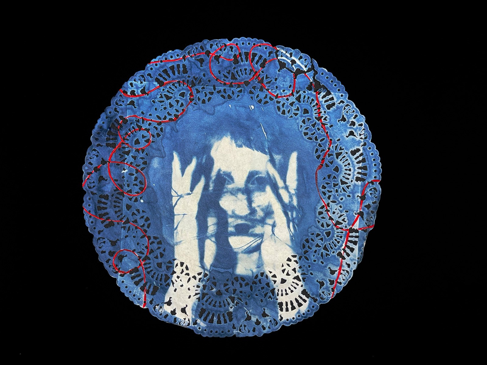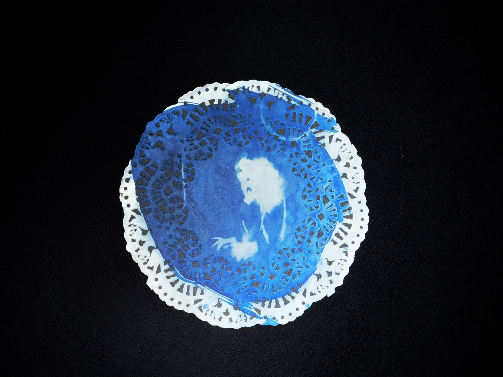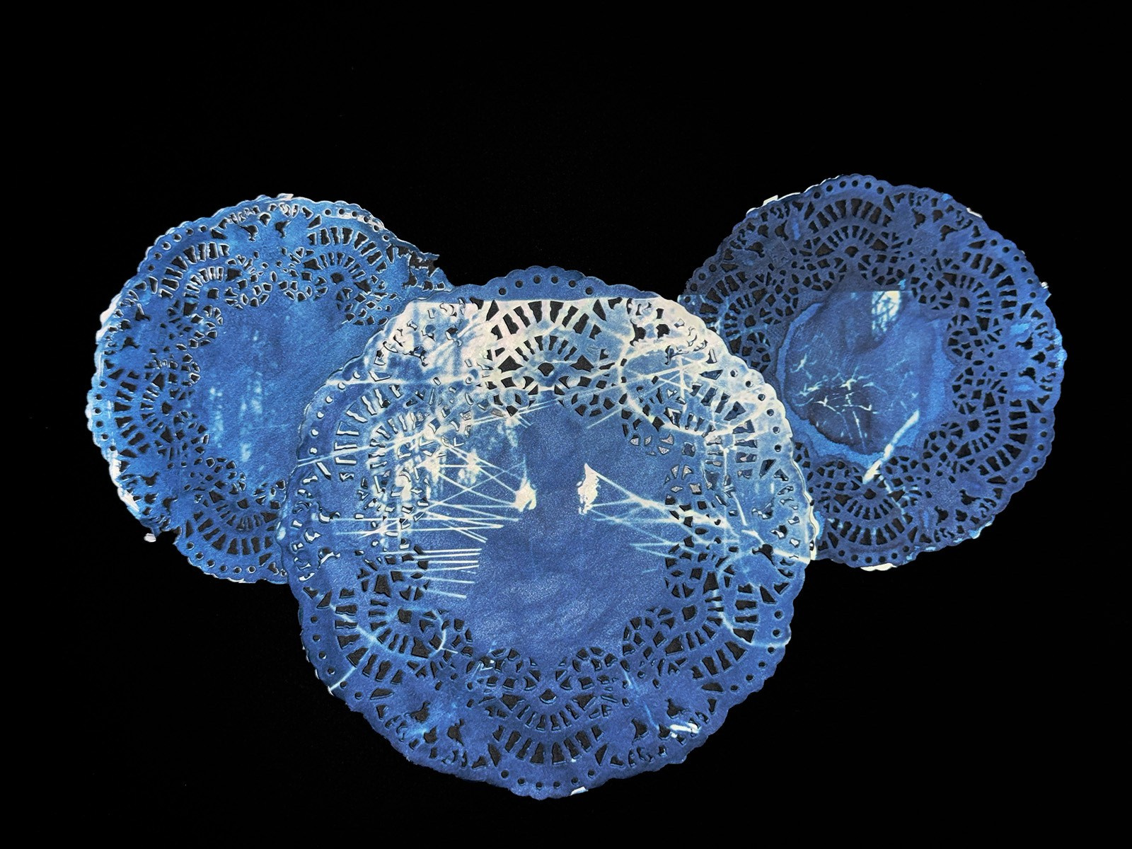 Использование цианотипии на пористом, тонком материале создаёт дополнительный смысловой уровень. Неровности, разрывы и вариативность печати становятся визуальными следами времени, уязвимости и трансформации. Изображение проявляется не как жёсткое утверждение, а как процесс — смягчающийся, вытекающий, изменяющийся. Так же изменчивы и коллективные представления, и культурные коды, которые мы наследуем и пересобираем.