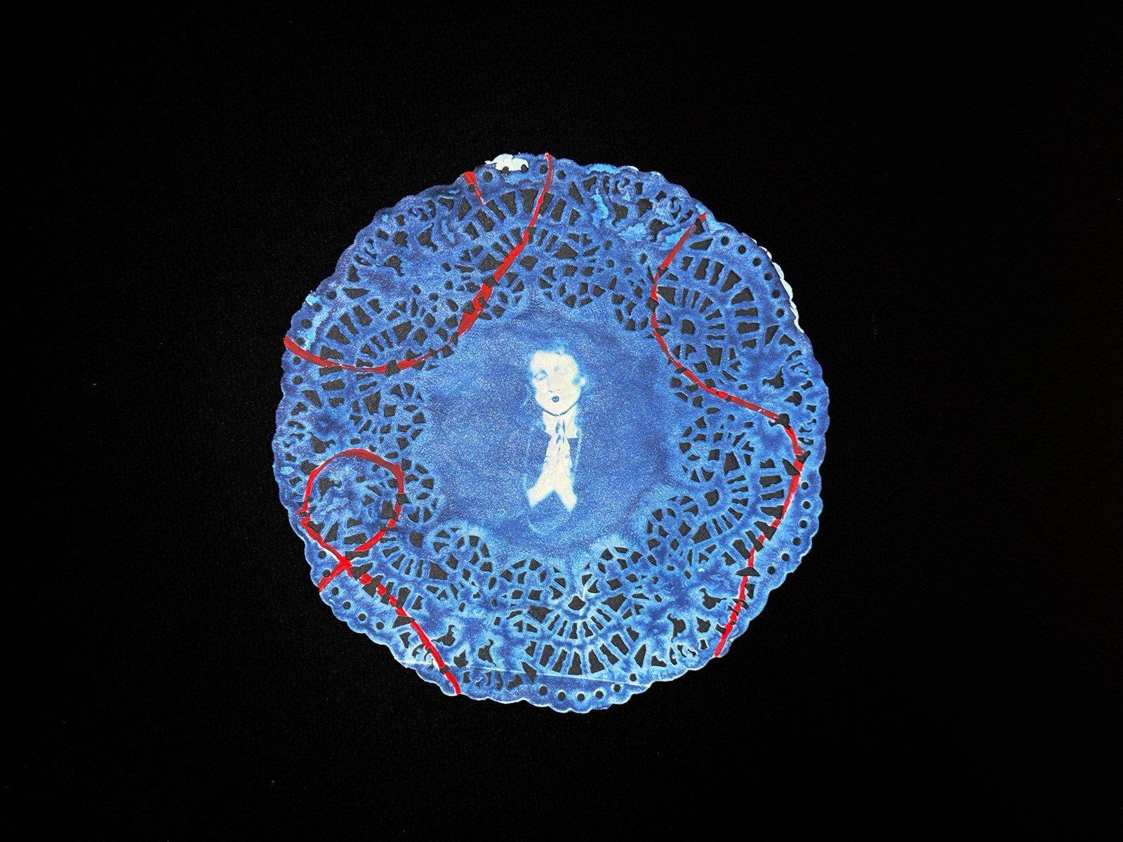Фотографии напечатаны в технике цианотипии на одноразовых кружевных салфетках, украшенных изображением государственного герба — повседневном, утилитарном объекте, привычно присутствующем в бытовой среде.Перенос официального символа на хрупкий, недолговечный материал усиливает исследование того, как репрезентативные знаки теряют дистанцию и становятся частью повседневного визуального поля.
